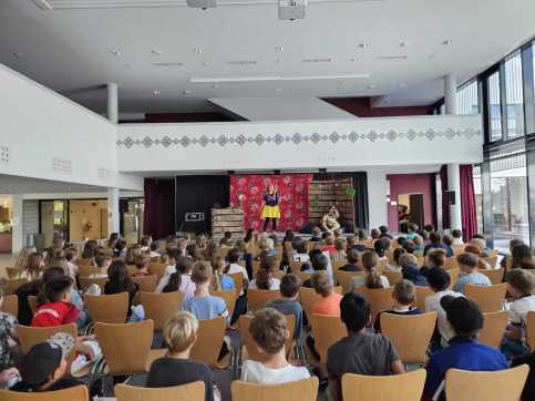 Die Spannung war groß, als uns am 18. Juli 2025 zum wiederholten Mal die englischsprachige Theatergruppe Theatre @School besuchte. Der gesamte 5. Jahrgang hatte sichtlich Freude, als in der Aula das interaktive Musical The Magic Shop aufgeführt wurde – eine farbenfrohe, unterhaltsame und spannende Reise in die Welt der Zauberei.