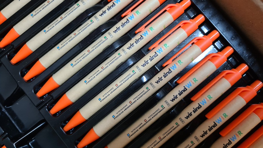 Zuletzt konnten die Schülerinnen und Schüler ihre Feedbacks zum WIR am HöSi schriftlich festhalten: Mit dem umweltfreundlichen Kartonage-Kugelschreiber, der mit dem Jahrgangsstufen-Motto bedruckt ist und – wir danken unserem Förderverein – an alle Teilnehmenden ausgegeben wurde zur Erinnerung an unseren täglichen Einsatz fürs „Miteinander.Füreinander.WIR!“ am HöSi.